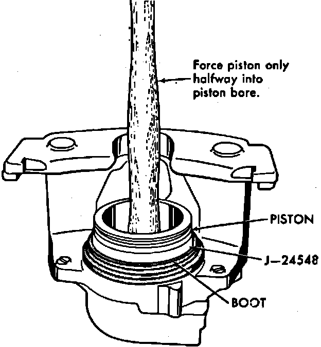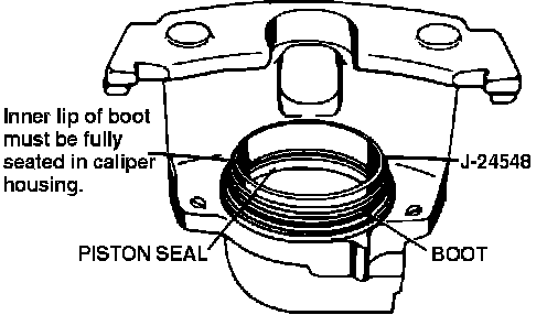 6. Remove tool J-24548 and seat small lip of boot in caliper piston groove, then bottom piston in bore.