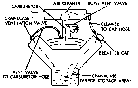 During certain engine conditions more blow-by gases are created than the ventilator valve can handle. The excess is returned through the air intake tube to the air cleaner and carburetor where it is burned in the engine.