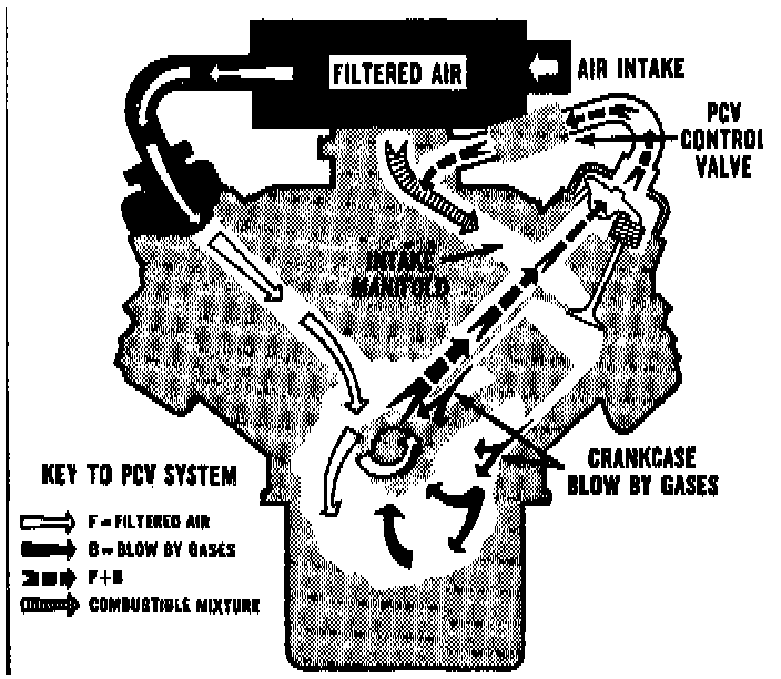The PCV system prevents blow-by gasses from entering the atmosphere by routing blow-by gases into the intake manifold through a vacuum controlled ventilating valve and a hose while allowing proper crankcase ventilation.