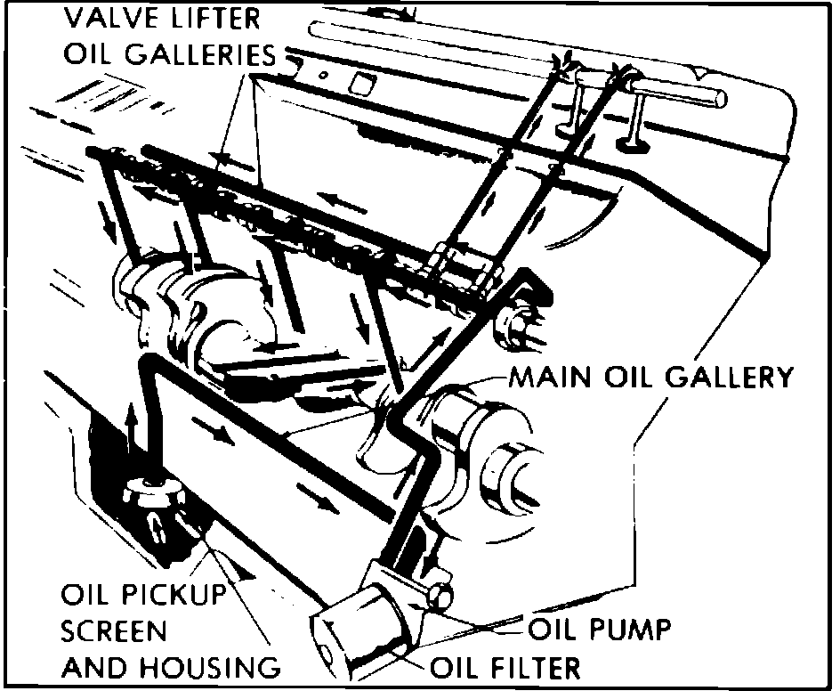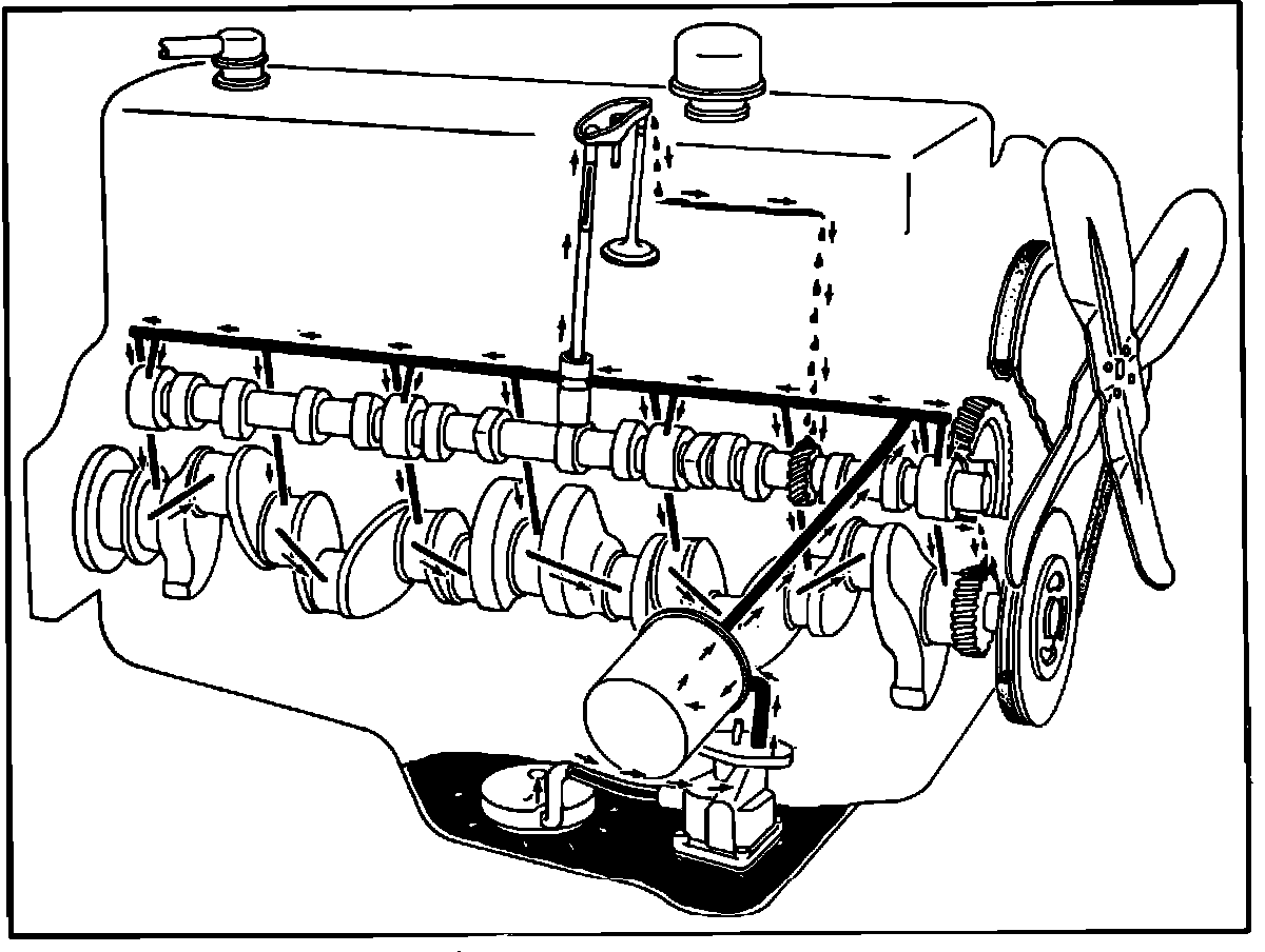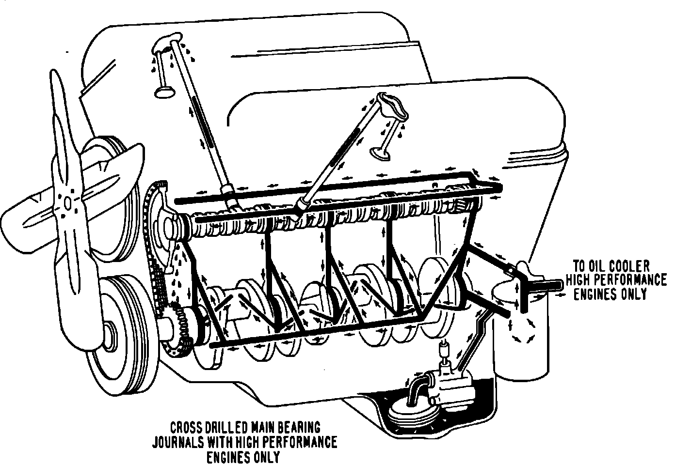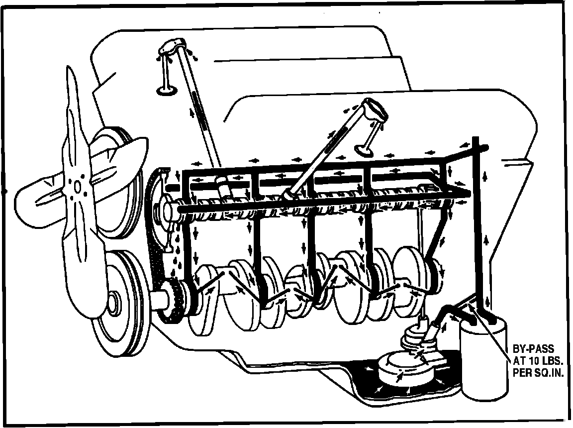 3. Remove oil pan bolts and allow pan to drop. To remove oil pan, front wheels must be turned to the left, also the crankshaft may have to be turned to provide clearance.
