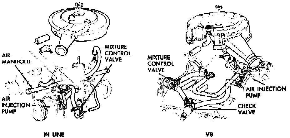 Air pump systems used--Figs 1 and 2--consist of a belt driven air injection pump--Figs 3, 4 and 5--air injection tubes (one for each cylinder), an air bypass valve, a mixture control valve 1966-67 models or diverter valve 1968-82 models, a differential vacuum delay valve, a separator valve, a vacuum differential valve (California only) and check valves (one for In-Line engines, two for V8's).