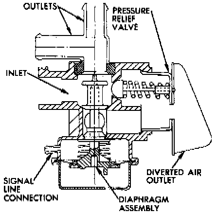 The diverter or air bypass valve--Figs 7 and 8--when triggered by a sharp increase in manifold vacuum, shuts off injected air to the exhaust preventing backfiring during this richer period.