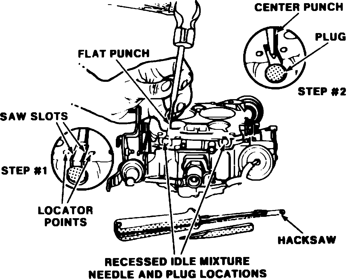 2. Using a suitable hacksaw blade, make two parallel cuts on each side of locator point in throttle body, below idle mixture needle plug, Fig 18. The cuts should extend down to steel plug, but not more than 1/8 inch beyond locator point. The distance between saw cuts depends on size of punch used.