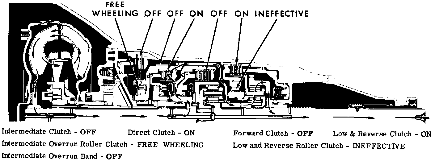 With selector lever in "D" Drive range, the forward clutch is applied. This delivers torque from the in ut shaft through the forward clutch, to the input ring gear in a clockwise direction. Clockwise rotation of the input ring gear causes the output planet pinions to rotate in a clockwise direction, driving the sun gear counterclockwise. In turn, the sun gear turns, causing the reaction carrier and planet pinions to turn clockwise. Clockwise rotation of the reaction carrier planet pinions causes the output ring gear and output shaft to turn in a clockwise direction at a reduction of 2.52 to 1. The reaction of the reaction carrier planet pinions against the output ring gear is taken by the low and reverse roller clutch which is grounded to the transmission case.