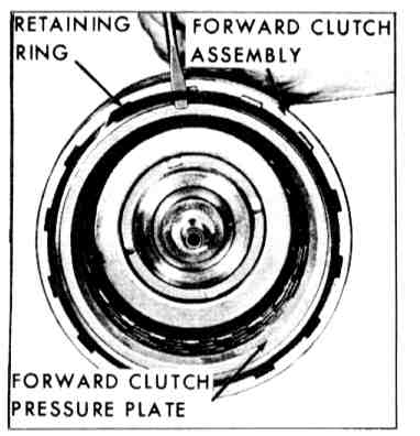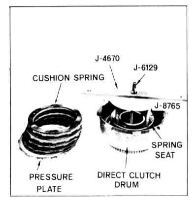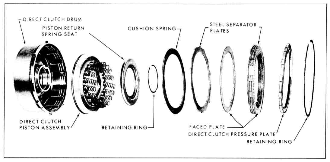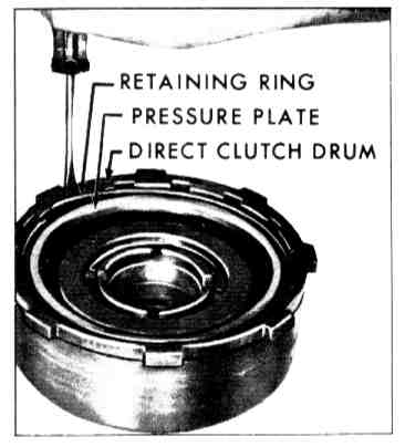 1. Remove direct clutch retaining ring, pressure plate and clutch pack.