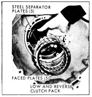 8. Install low and reverse clutch pack. Notch in steel plates toward bottom of case.