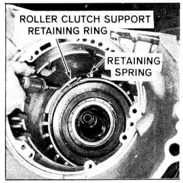 9. Install low and reverse roller clutch support retaining spring, then install support. Align tangs on inner race with slots in reaction carrier. Install retaining ring.