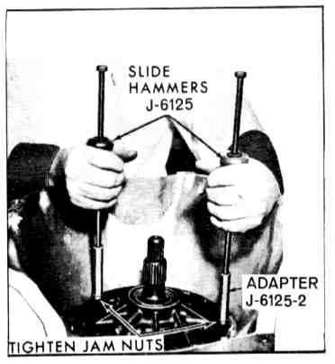 19. Install two guide pins and using slide hammers to hold pump, align and drive pump home. Torque to 15-25 ft lbs. If the input shaft cannot be rotated clockwise as the pump is being bolted into place, the direct clutch and forward clutch housing has not been properly installed to index the face plates with their respective parts. This condition must be corrected before the pump is bolted into place.