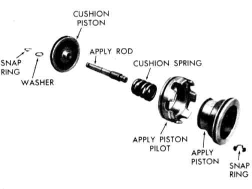 1. Install new seals on accumulator piston and install piston, spring and cover. Compress cover and install retainer ring.