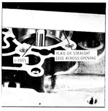 20. Checking band apply pin. If tool J-23071 is below the straight edge surface, the long pin (with groove) should be used. If tool is above the straight edge, the short pin (without groove) should be used. Identification groove is located on the band lug end.
