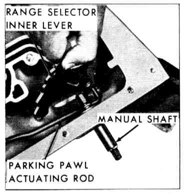 23. Install new lip seal, manual shaft, range selector lever parking pawl rod and nut. Torque to 30 ft. lbs.