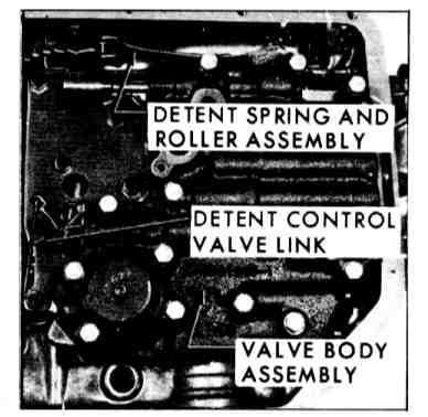 29. Install valve body and gasket, spacer support plate (do not tighten) and spacer plate gasket. Install detent valve link in actuating lever. Install valve body while installing manual link in range selector lever, When handling valve body, do not depress sleeves as retaining pins will fall into transmission.