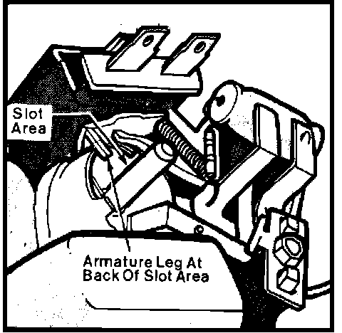 2. If relay armature leg is in No. 2 position, Fig. 19, push button and check if relay armature leg drops on armature leg ramp and pump completes wash cycle and wiper shuts ``Off'' in position 1. If relay armature leg drops back into slot, motor is defective.