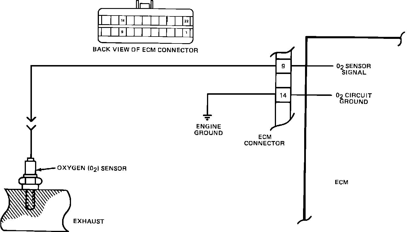 The ECM supplies a voltage of about .45V between Terminals "9 and 14". (Voltage may read as low as .32V when measured with a 10 megohm DVM.) The O2 sensor varies the voltage within a range from about 1 volt if the exhaust is rich down through about .1V if exhaust is lean.