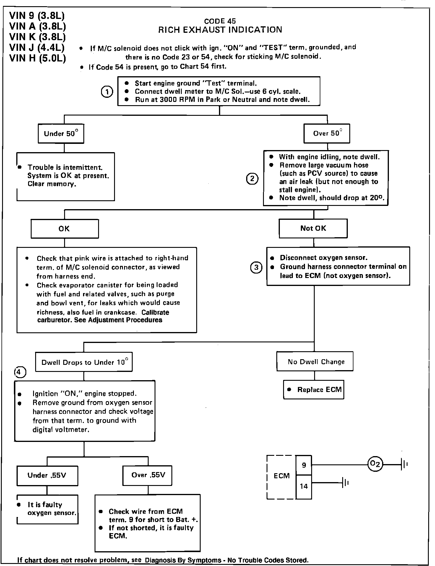 3. This step tests to see if ECM is able to respond to a lean exhaust O2 signal (low voltage). If no dwell change with a grounded lead to O2 sensor Term. "9", fault is in ECM. It couldn't be an open O2 wire because that would set Code 13.