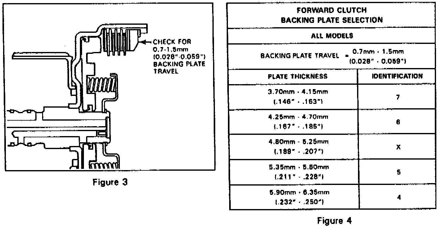 Apply an evenly distributed load in the direction indicated in Figure 3, to remove slack from the clutch assembly. Use 20 lbs (9kg) of pressure against the backing plate -- excessive pressure will cause an inaccurate measurement. With the clutch assembly compressed, use a feeler gage to measure the distance between the backing plate and snap ring. Correct backing plate travel is 0.7 mm-1.5 mm (0.028"-0.059").