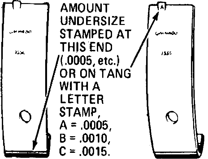 Main bearing inserts are available in standard sizes and undersizes of .0005, .0010 and .0015 inch. On 1983---84 models, a letter stamped on the bearing tang identifies the size of the bearing, Fig. 53. The undersize is also stamped on the bearing insert on the other side of the insert tang, Fig. 53. On 1980---81 models, the amount of undersize and part number is stamped on the bearing shell, Fig. 54.