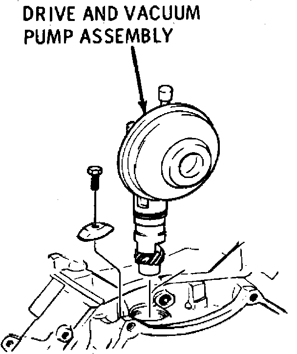 12. Disconnect vacuum lines at vacuum pump. Remove vacuum pump, if equipped with A/C, or oil pump drive assembly, if less A/C, Fig. 25.