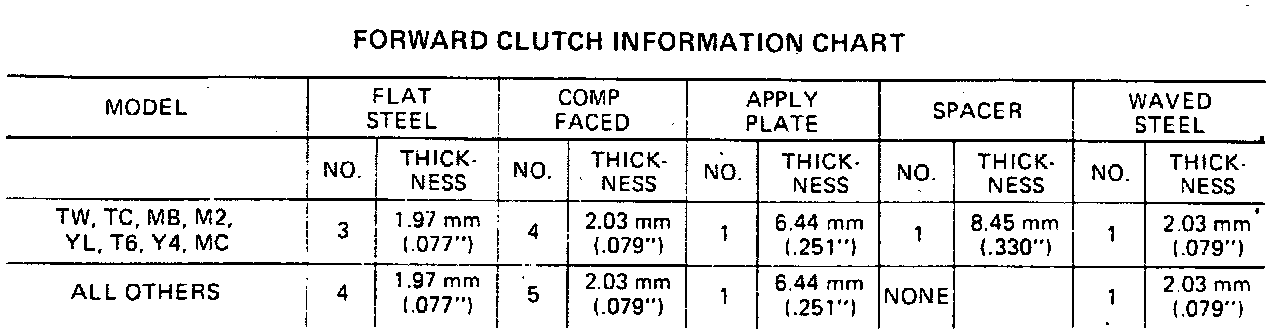 19. A forward clutch which requires five steel forward clutch plates will use a single thick apply plate. A forward clutch which requires four steel forward clutch plates will use a thin apply plate and thick spacer plate.