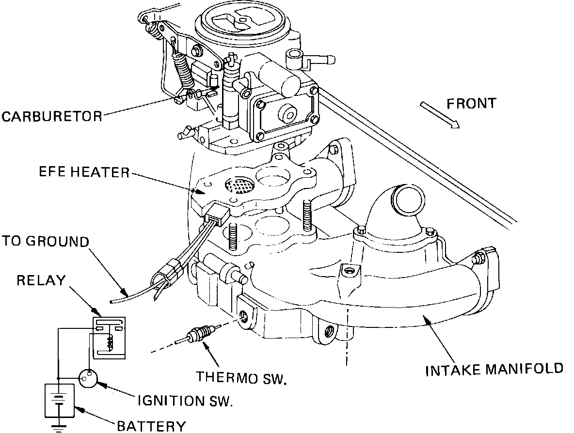 The electric EFE system, Fig. 34, incorporates a ceramic heater grid located beneath the primary bore of the carburetor as part of the carburetor insulator gasket. Its purpose is to heat the incoming fuel/air mixture for improved vaporization and driveability during cold engine operation.
