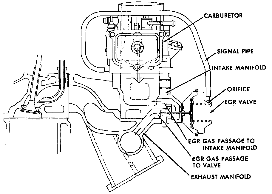The EGR valve, Fig. 17, mounted on the intake manifold is used to control the amount of recirculated gas. The recirculated gases are drawn into the bottom of the intake manifold riser, through the exhaust manifold heat stove and to the EGR valve. The EGR vacuum diaphragm is connected to a timed signal port at the carburetor flange.
