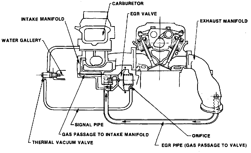 This system, Figs. 14, 15, 16 and 16A, is used to reduce oxides of nitrogen emissions by lowering the peak combustion temperature in the engine. This is accomplished by introducing a metered amount of exhaust gases into the intake manifold at throttle positions other than idle.