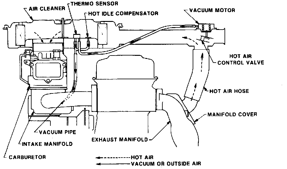 These systems consist primarily of a thermo sensor, vacuum motor, hot air valve and hot idle compensator--mounted on the air cleaner body and snorkel--Figure 5.