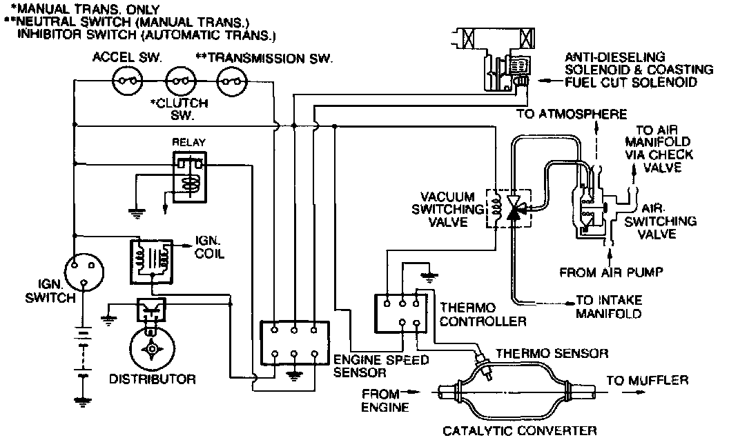 When the vehicle is coasting, the Coasting Richer System and AIR System are both in operation to prevent overheating of the catalytic converter due to poor combustion. When the catalytic converter temperature reaches 1350° F. due to high temperature and in- creased load driving conditions, the AIR system air is diverted to atmosphere in order to reduce the chemical reaction. When catalytic converter temperature exceeds about 1S30° F. due to a malfunction such as an ignition failure, a warning light and buzzer indicate an overtemperature condition.