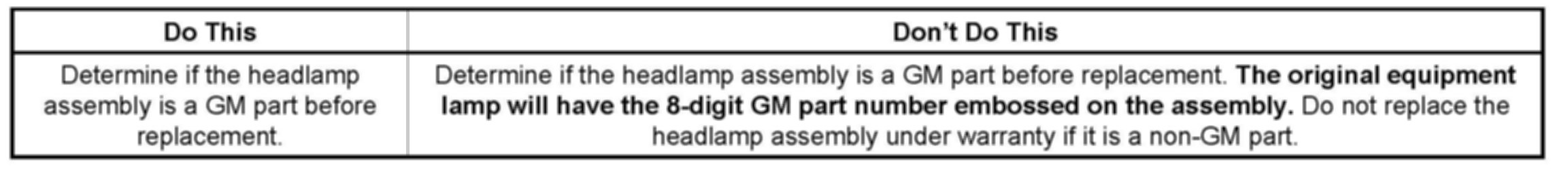 This bulletin is being issued to inform dealers that whenever a headlamp replacement under warranty is necessary, be sure to use the correct General Motors (GM) approved headlamp assembly.