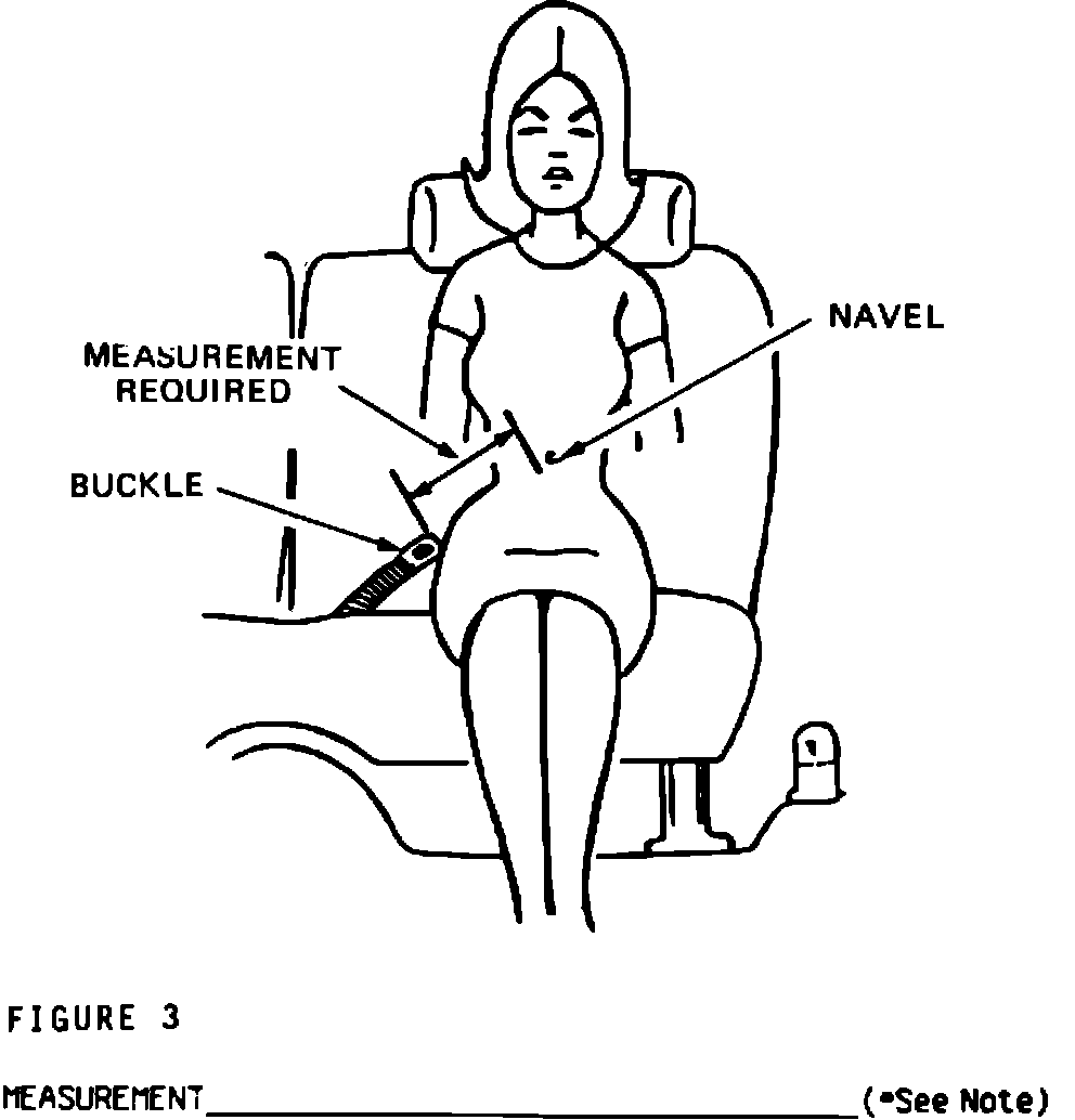 Place the seat in the position that it is in when you drive or ride in the car. With you sitting in the seat make sure that the buckle is extended as far through the seat as possible. This may be done by giving the buckle a hard pull. With the buckle resting against your hip, measure from the lap area directly below the navel to the front edge of the buckle (Figure 3) and note dimension below.