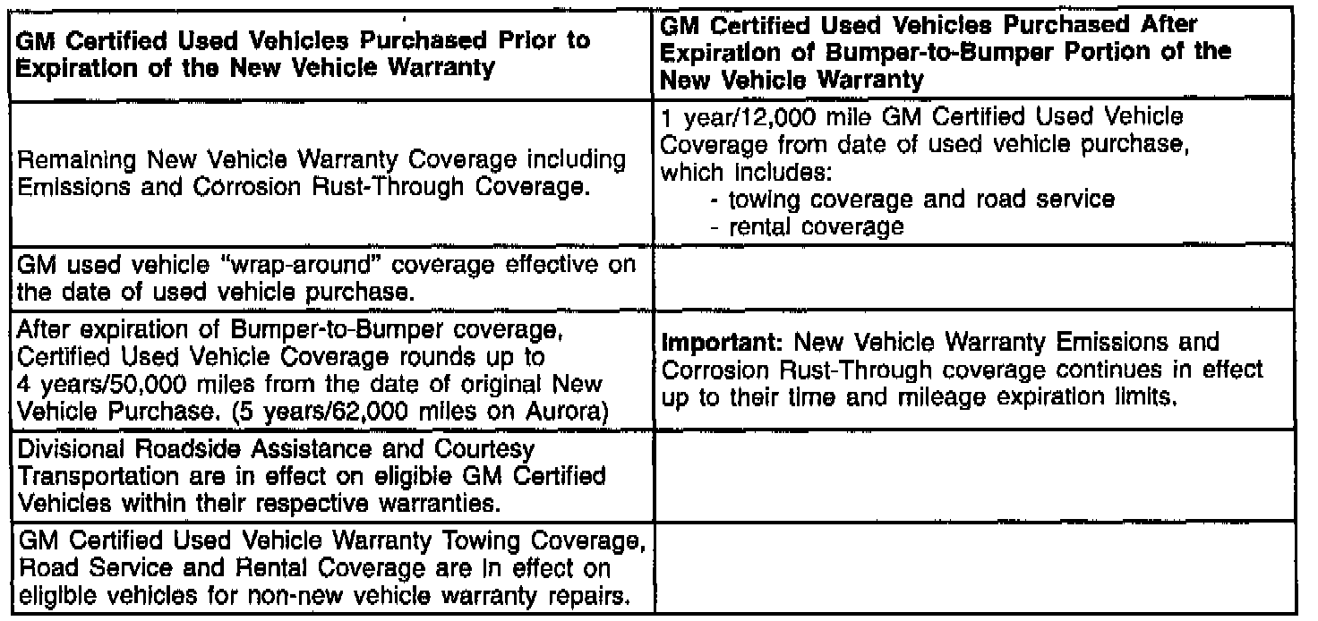 The chart above as well as the chart shown at the end of this bulletin provides a brief summary of coverages when a certified vehicle is within or beyond the New Vehicle Warranty. Refer to the GM Certified Used Vehicle Limited Warranty and Owner Assistance Information booklet and the appropriate New Vehicle Warranty and Owner Assistance Information booklet for coverage details.