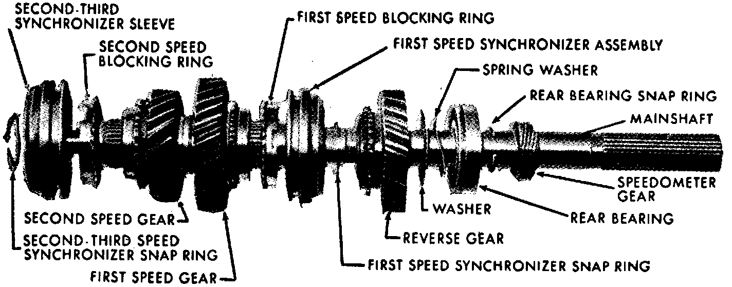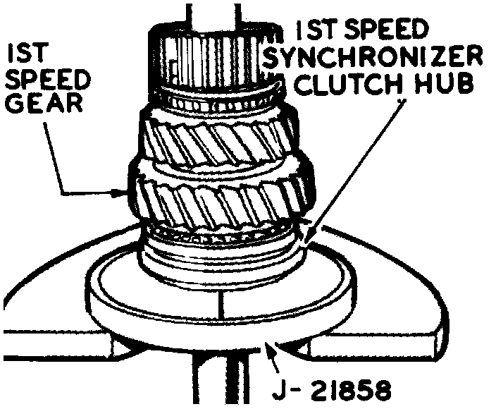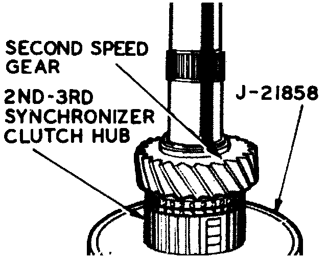a. Install second speed gear with synchronizing teeth facing upward. Rear face of gear will seat against flange on mainshaft.