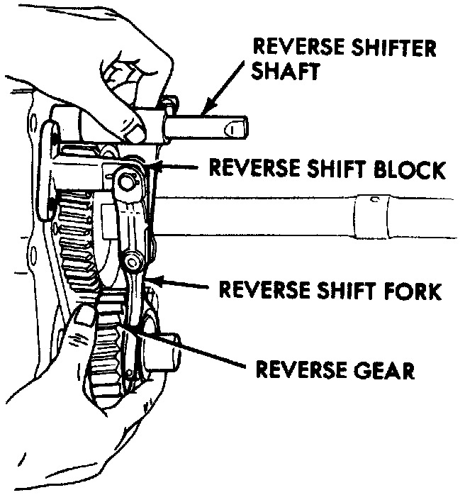 7. Remove reverse block retaining bolts and remove reverse shifter shaft, shift block, shift fork, and reverse gear as an assembly.
