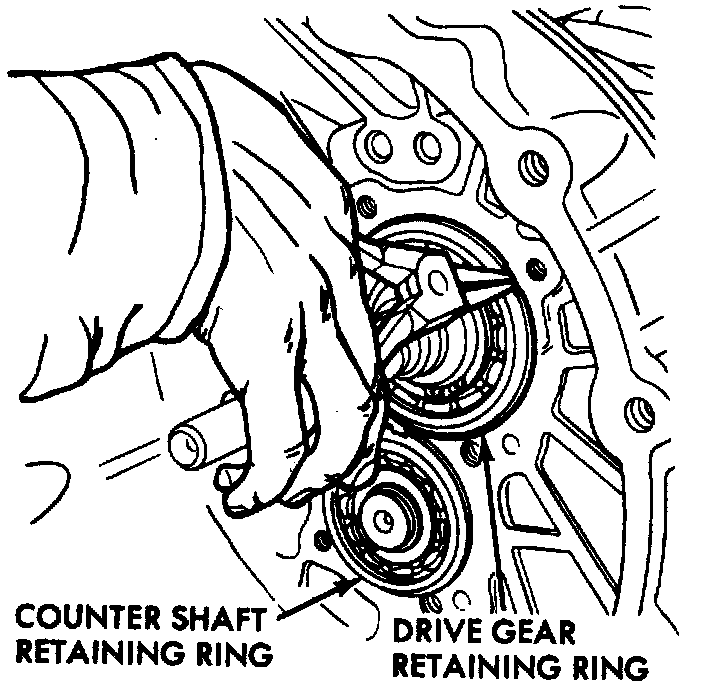 8. Remove retaining ring from drive gear shaft bearing outer race, then remove retaining ring from countershaft front bearing outer race.