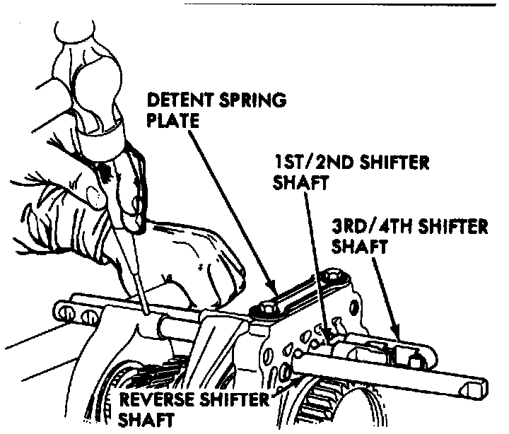 12. Place the three shifter shafts in neutral position and remove reverse shifter shaft, 1st/2nd shifter shaft, and 3rd/4th shifter shaft in that order, being careful not to lose interlock pins or detent balls.