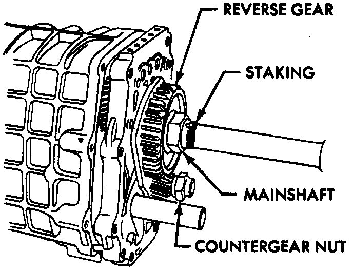 15. Using suitable tool, raise staking on mainshaft rear nut and remove nut, then remove reverse gear from mainshaft.