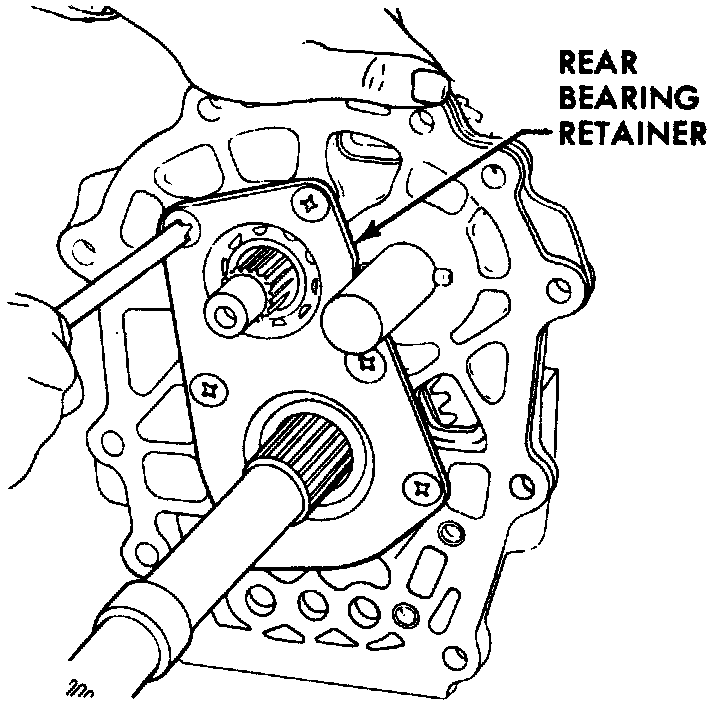 17. Place synchronizers in neutral positions, then remove rear bearing retainer from center support.