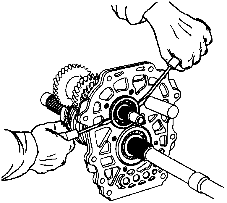 18. Slide rear bearing outer race rearward by moving countershaft fore and aft and, using suitable tool, remove outer race.