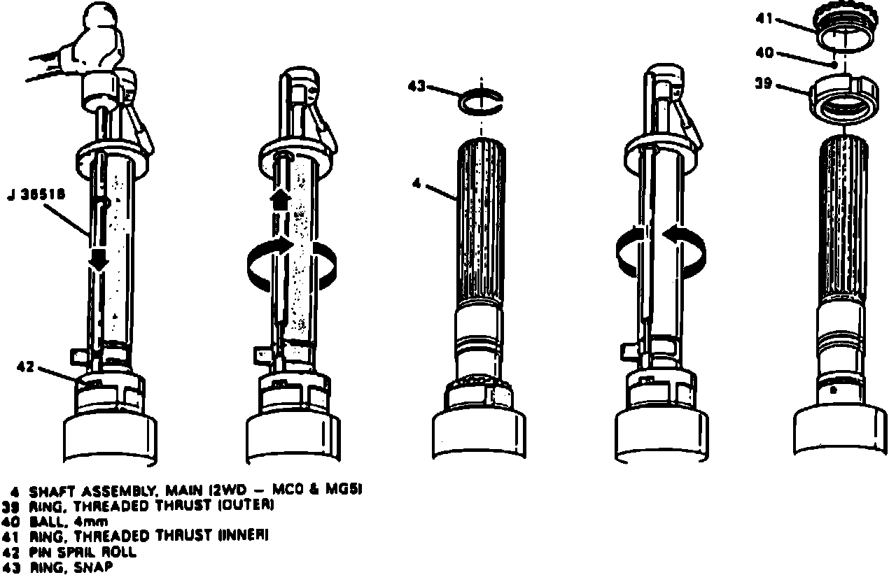26. Remove snap ring (43), then threaded inner thrust ring (41), ball (40) and outer threaded thrust ring (39). Hold countershaft against mainshaft and turn output shaft spanner tool No. J-36516 clockwise until both threaded thrust rings are completely apart.