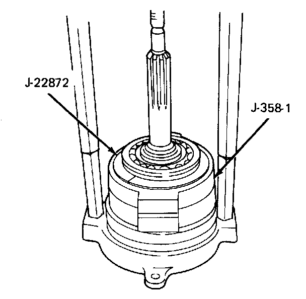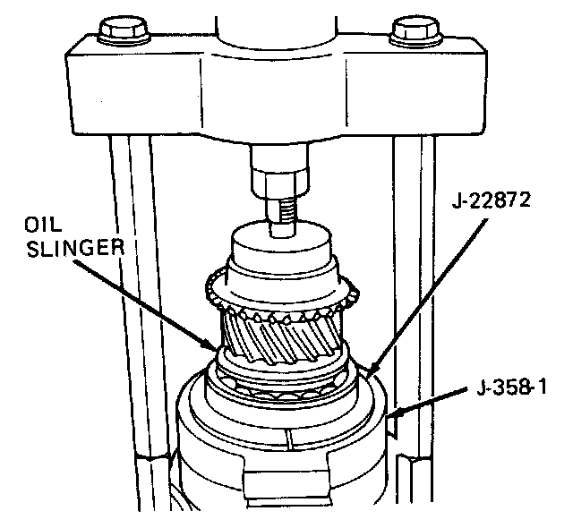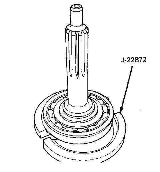3. To remove bearing, position tool J-22872 to the bearing and using an arbor press and tool J-358-1 press gear and shaft out of bearing.