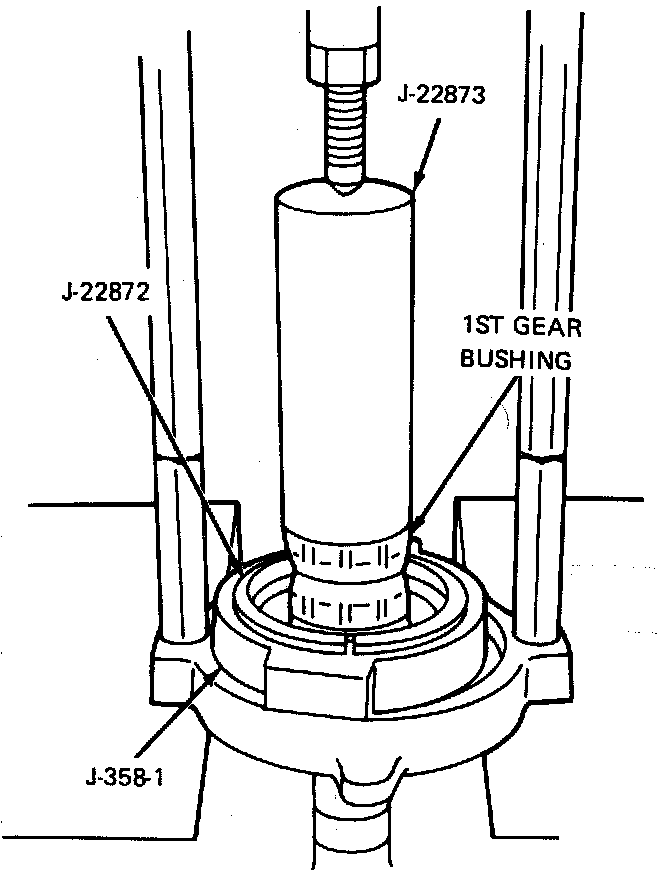 4. Using tool J-22873 press 1st speed gear busing onto mainshaft until it bottoms against hub. Lubricate all bushings with E.P. oil before installation of gears.