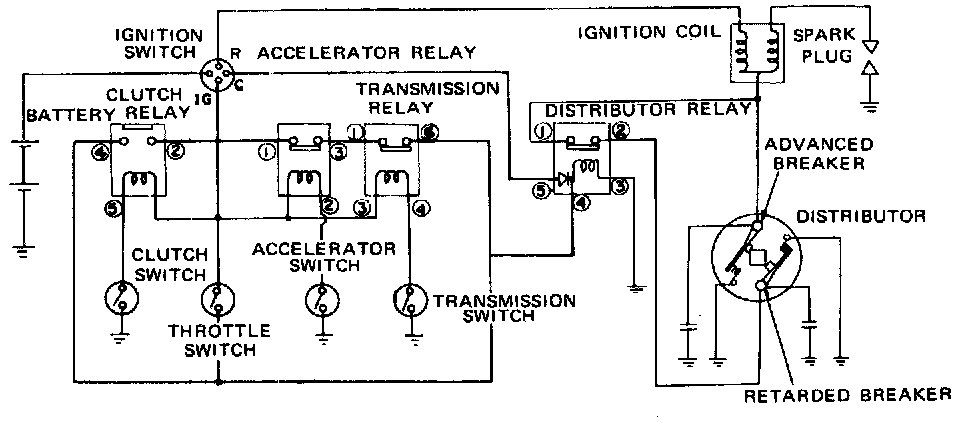 The distributor relay is energized by the operation of the ignition switch, accelerator relay, transmission relay, throttle switch or clutch relay. Under any one of these conditions, the distributor circuit it switched from the retarded breaker point circuit to the advanced breaker point circuit.