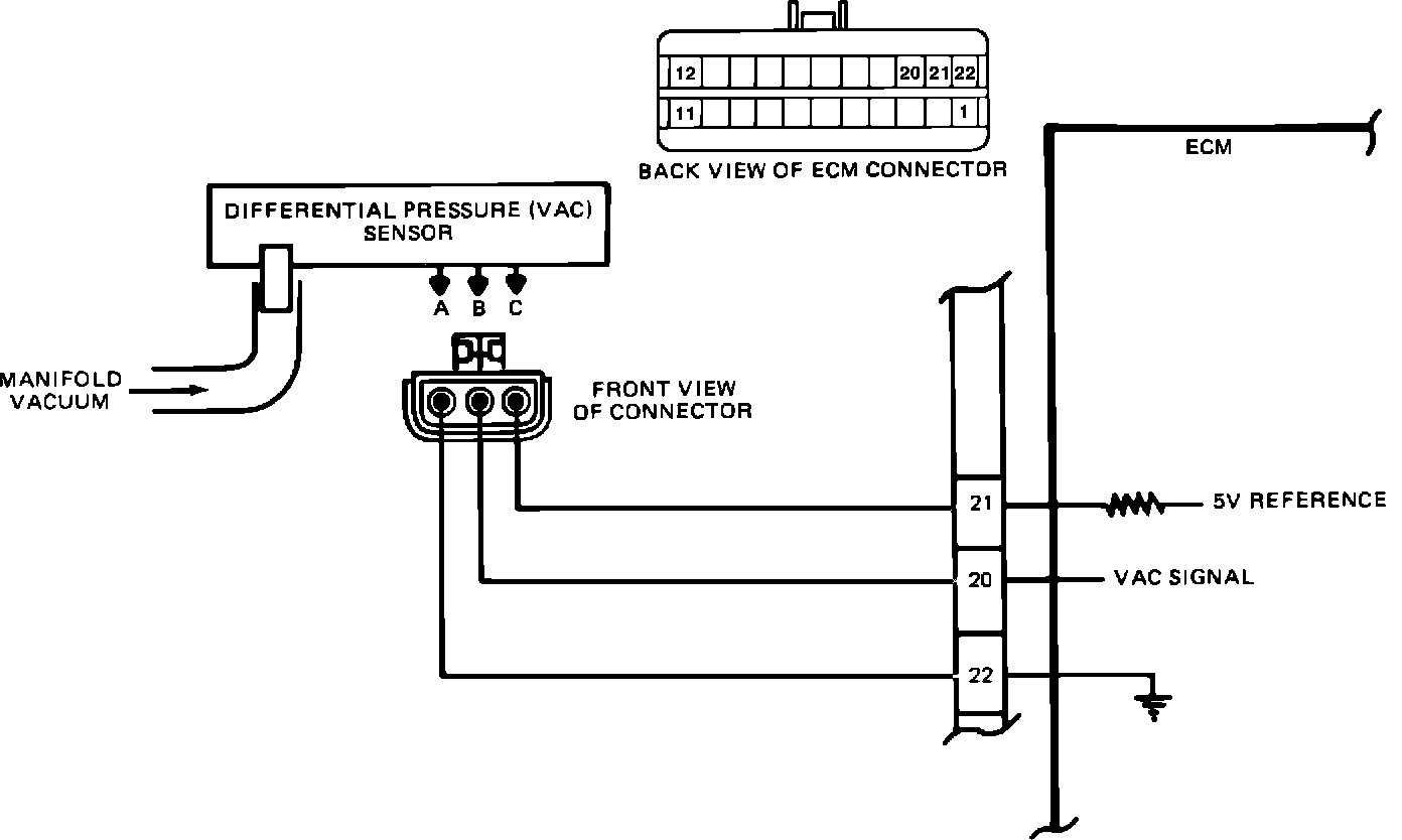 3. Checks for a ground in wire from Term. "B" of vacuum sensor to ECM. This would be the case if the voltage went up over 2 volts when the line was opened.