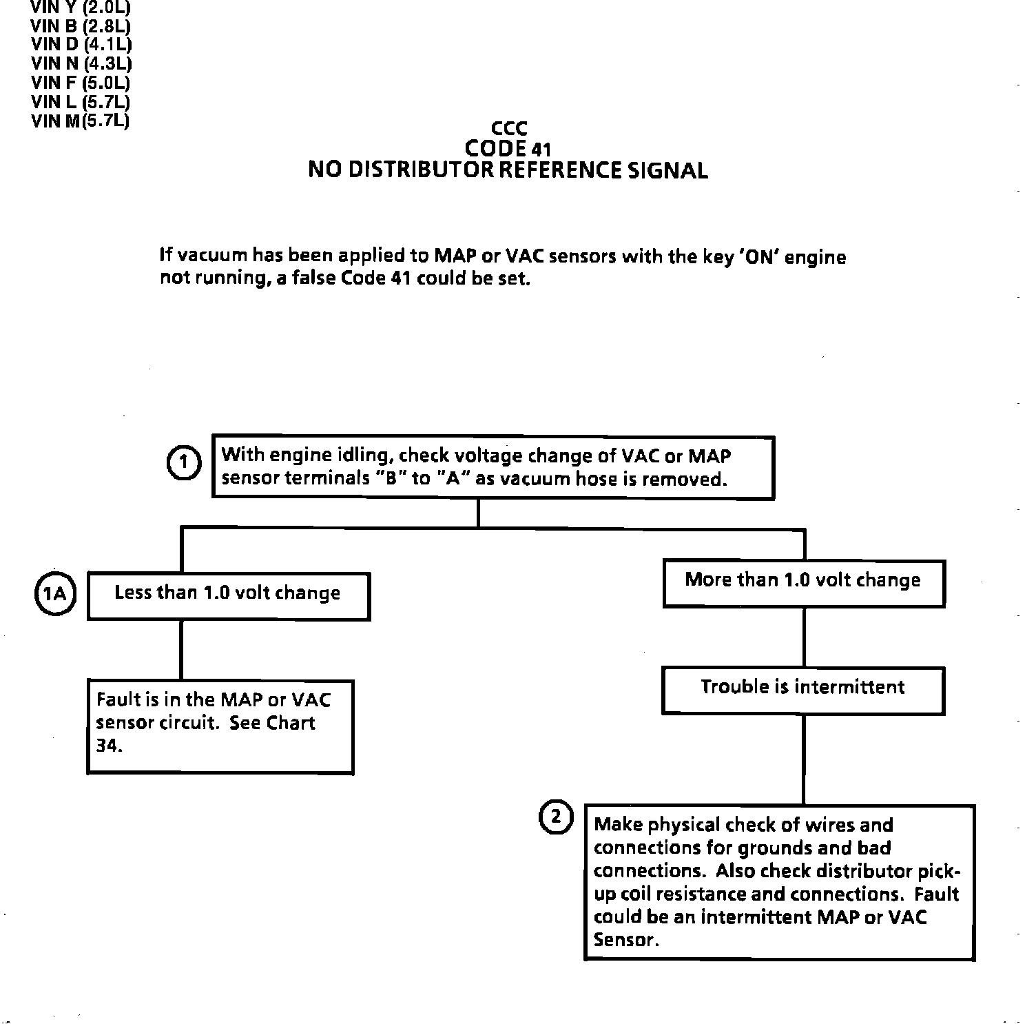 Code 41 says that there are no distributor references pulses to the ECM at a specified engine vacuum. This code could set with the key "ON", engine "Not Running" if the MAP or vacuum sensor was defective by indicating "Engine Running" voltage with just the key "ON". With a constant open or ground in the reference signal circuit, Code 12 would be set along with a 41. Use Chart 12 if 12 and 41 are set. Code 41 alone indicates the problem is intermittent. When the distributor reference line signal is lost, the engine runs full rich and with retarded (base) spark timing. The result is poor performance, poor fuel economy, and possibly rotten egg odor from exhaust.