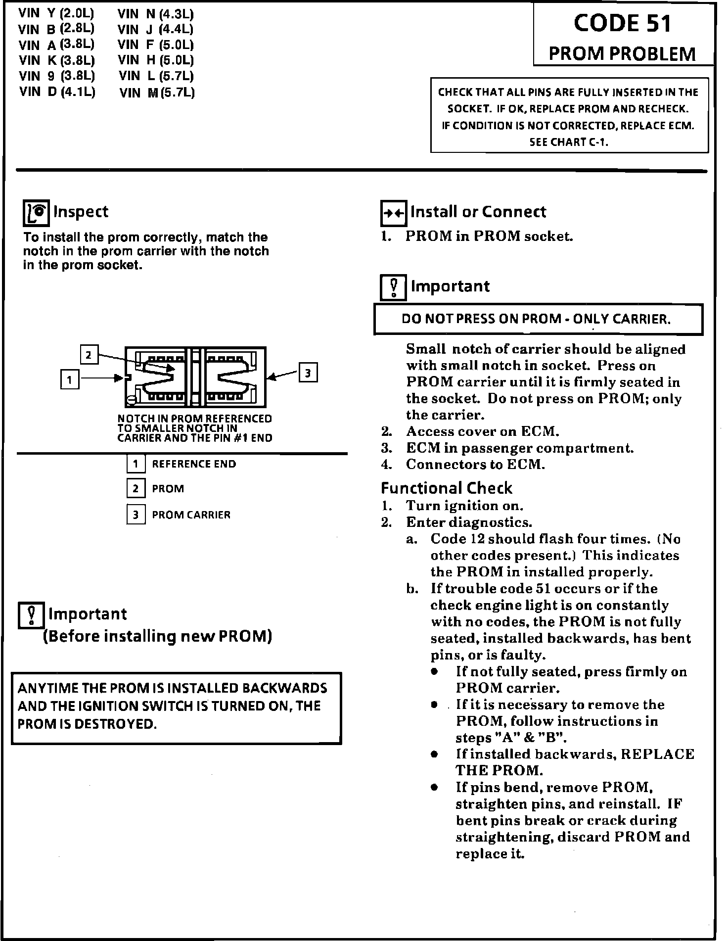 Check that all pins are fully inserted in the socket. If OK, replace PROM and recheck. If condition is not corrected, replace ECM. See Chart C-1.
