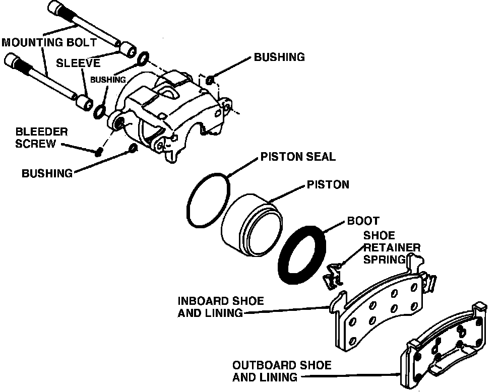 1. Inspect caliper bore for scoring, nicks, corrosion or wear. Replace caliper housing if bore will not clean up with crocus cloth.