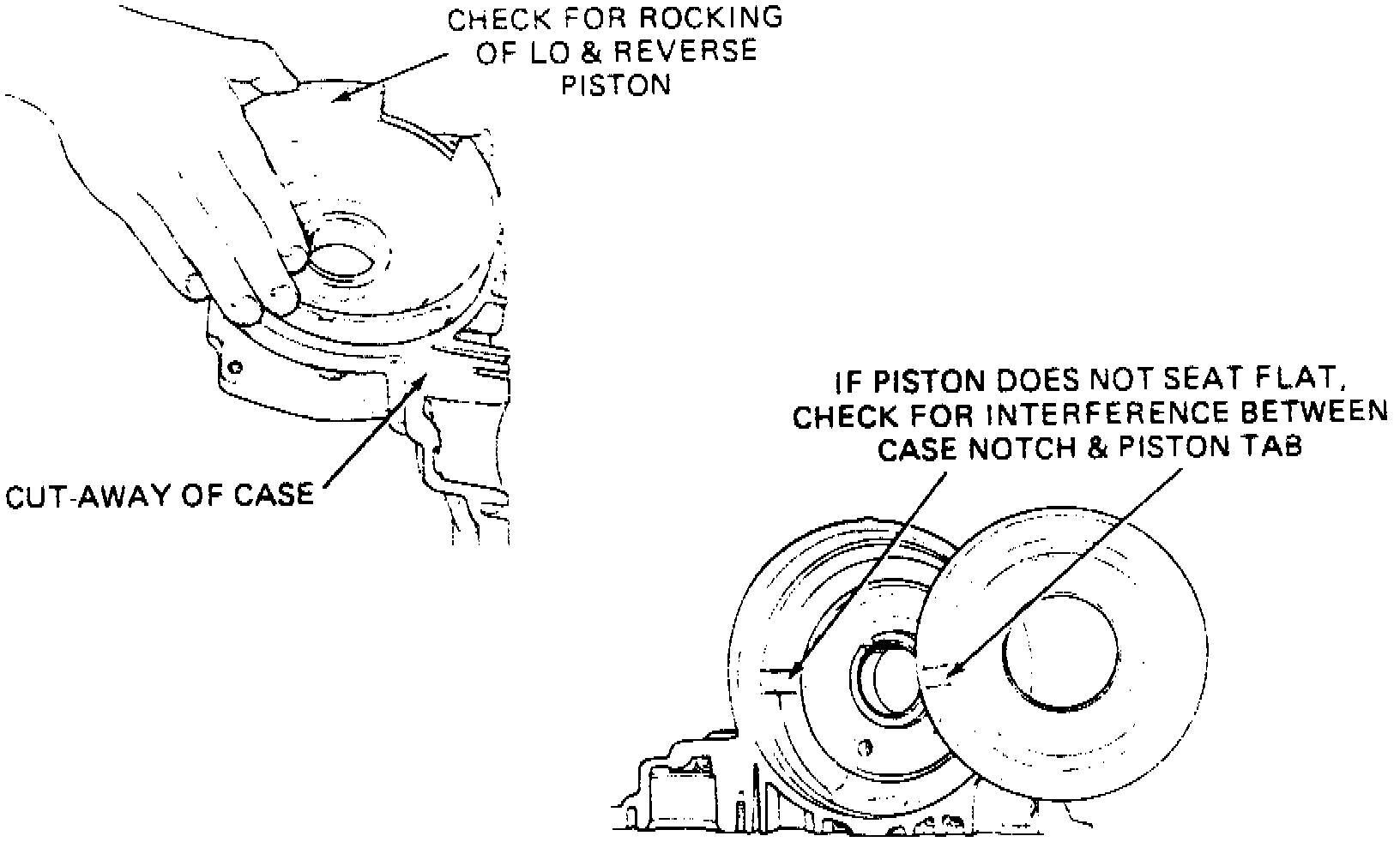 A condition of no-reverse, shudder in reverse, or delayed reverse may be caused by the low reverse piston binding in the case. The problem is that the tab on the piston is too wide, causing it to bind in the case notch. To check for interference, place the piston without seals into the case. If the piston rocks back and forth, file the sides of the tab until the piston will fit flat into the case, with no binding. Do not remove excessive material, or the piston could rotate to a point where it might interfere with the parking pawl.