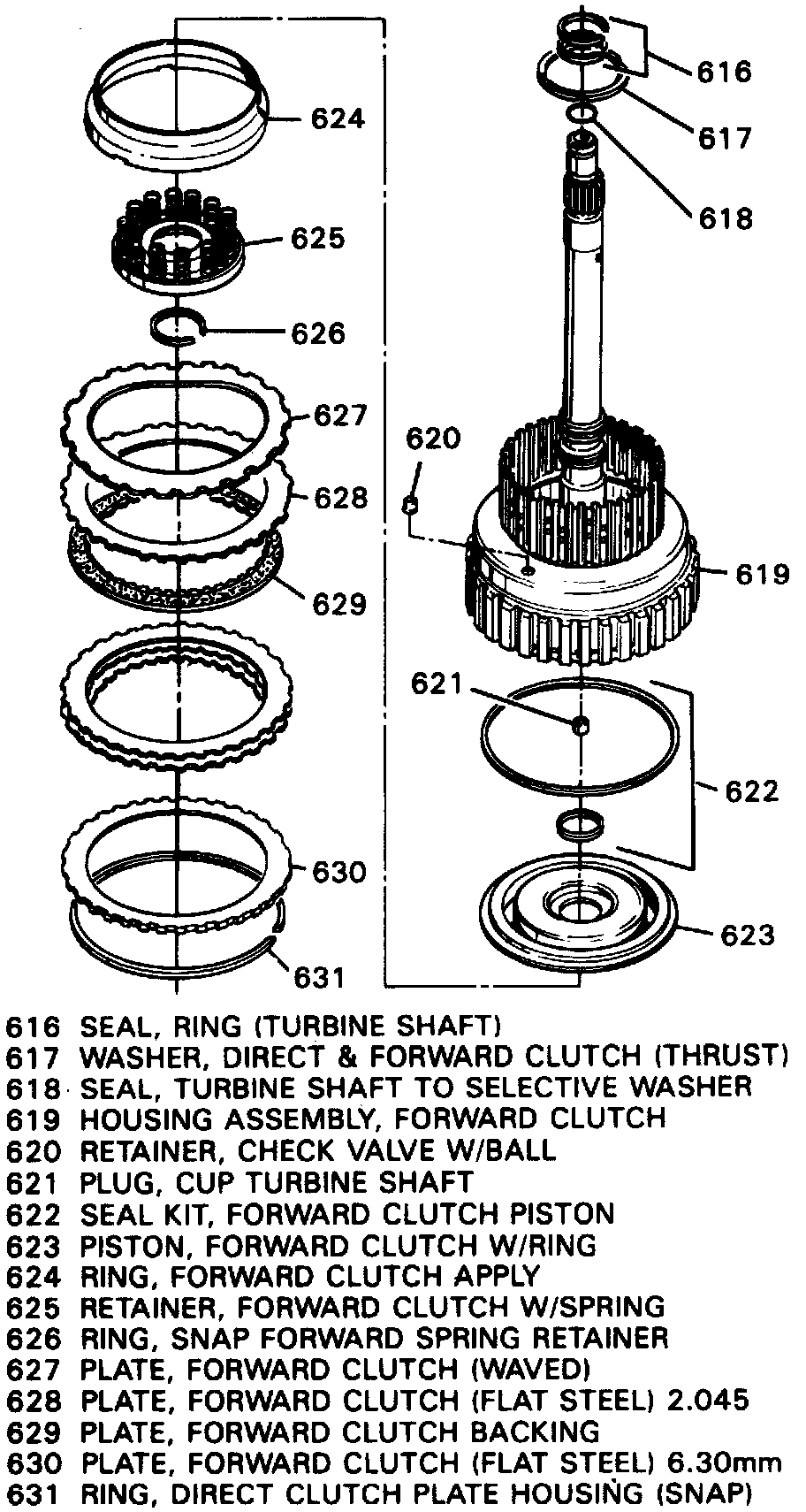 5. Remove snap ring (626), forward clutch spring assembly, then the forward clutch piston assembly with apply ring.