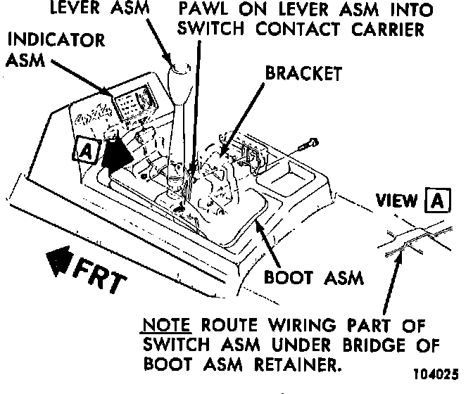 5. Position new switch on mounting bracket and install attaching screw.Ensure shift lever assembly pawl is on the switch contact carrier.