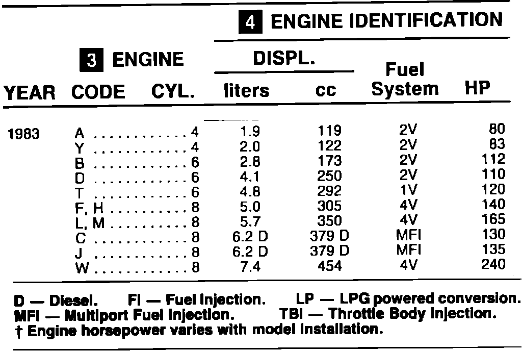 4 - ENGINE IDENTIFICATION: On the line where the engine code appears, read to the right to identify the engine.